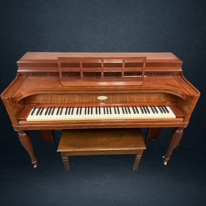 A rare Mid Century Steinway console piano with stunning wood grain and elegant, modern lines. Professionally restored and prepared in our workshop, this instrument offers the warm, responsive tone Steinway is known for in a compact and stylish design.